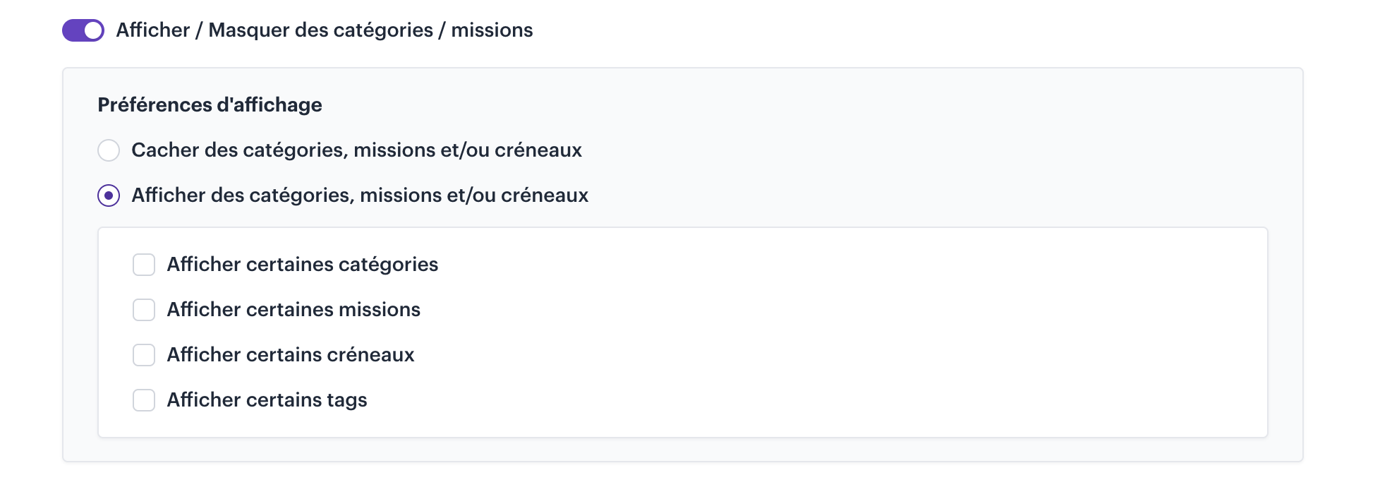 - Activez le bouton "Afficher des catégories, missions et/ou créneaux