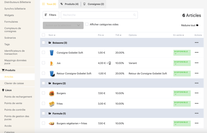 Tous les articles créés apparaissent sous forme de tableau dans la partie Configuration > Produits - Articles
