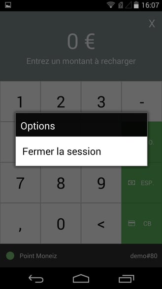 Appuyez 2 secondes sur le bandeau où est indiqué le solde, sur la partie haute de l'écran. Un menu apparait puis cliquer sur Fermer la session.