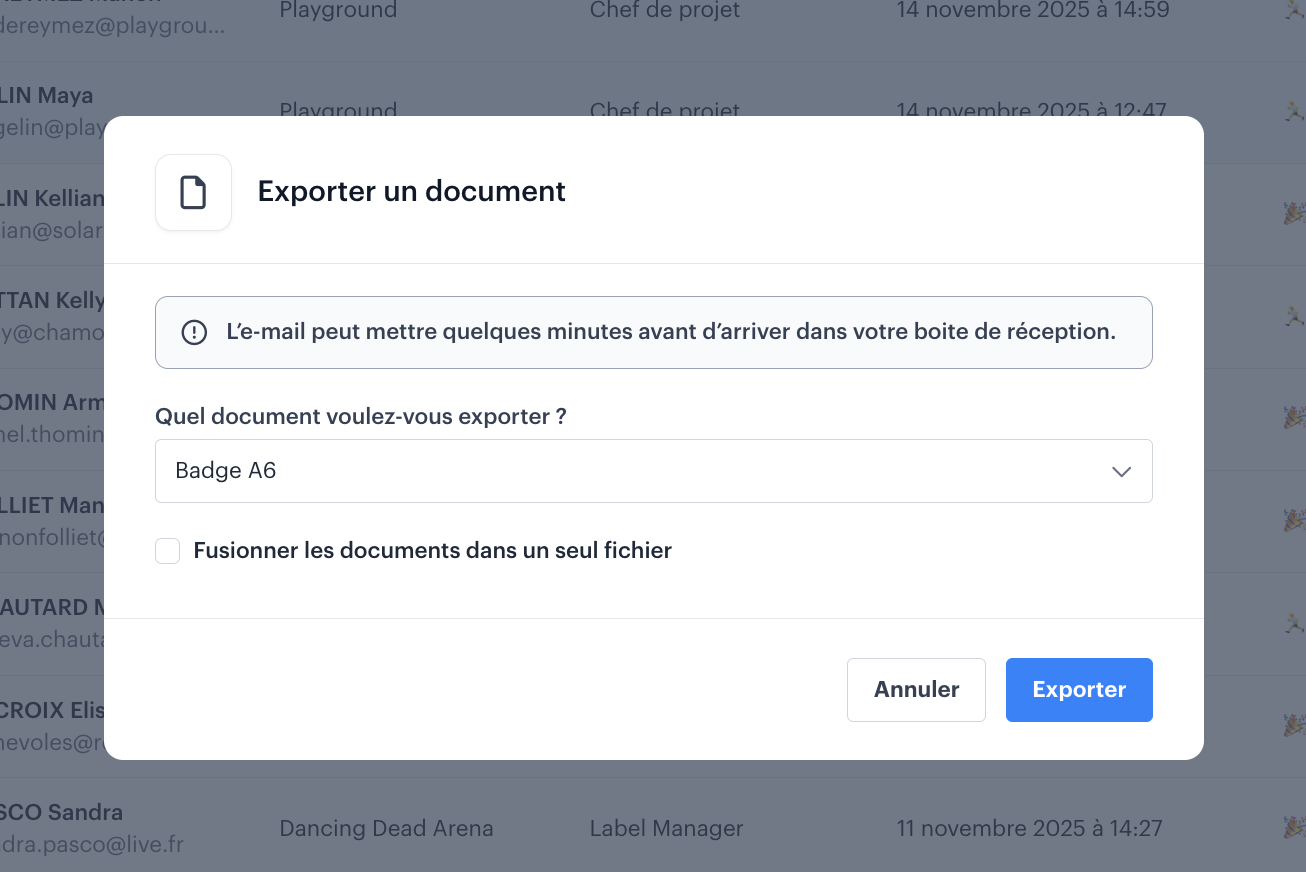 Sélectionnez le document que vous souhaitez générer puis cliquez sur le bouton Exporter.